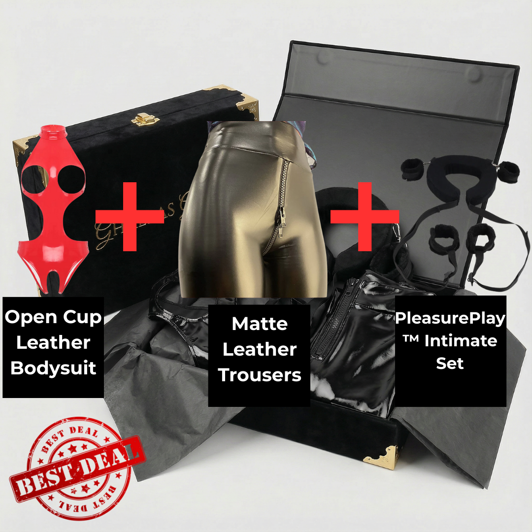 Kick off 2026 with our hottest bundle yet! This trio combines sultry sophistication with pure confidence. The Open Cup Leather Bodysuit delivers bold statement style, while the PleasurePlay™ Intimate Set brings playful allure to every moment. Complete the look with sleek Matte Leather Trousers that transition seamlessly from night out to night in. Three essentials, one unforgettable collection—designed for those who know what they want.